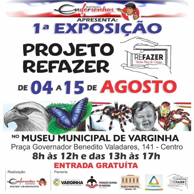 De 04 a 15 de agosto de 2025, a sala Nico Vidal, do Museu Municipal de Varginha, receberá a exposição do projeto “Refazer”. As artes são confeccionadas pelos alunos do projeto, realizado pelo desenhista Ender Alberto de Oliveira.