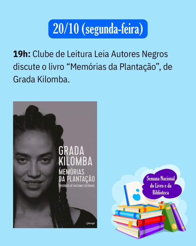 As atividades têm início no dia 20 de outubro (segunda-feira), às 19h, com o Projeto Rádio Malês – Leia Autores Negros, que discutirá a obra “Memórias da Plantação”, da escritora Grada Kilomba. O encontro propõe reflexões sobre memória, identidade e colonialismo.
