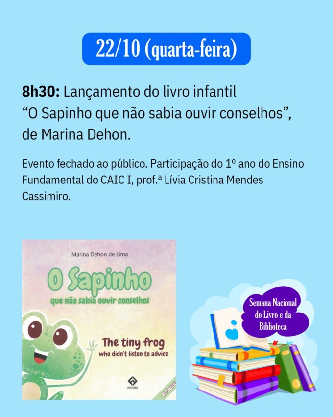 8h30: Lançamento do livro infantil “O Sapinho que não sabia ouvir conselhos”, de Marina Dehon.