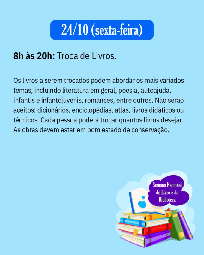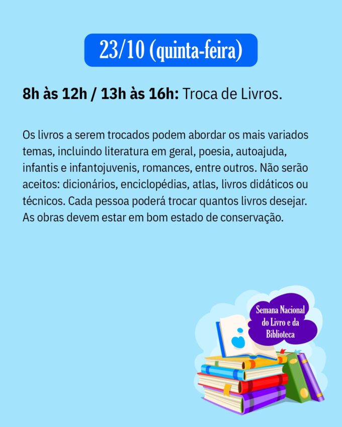Nos dias 23 e 24 de outubro (quinta e sexta-feira), será realizada a tradicional Troca de Livros, das 8h às 12h e das 13h às 16h na quinta, e das 8h às 20h na sexta-feira. A ação é uma oportunidade para que leitores compartilhem e descubram novas histórias.