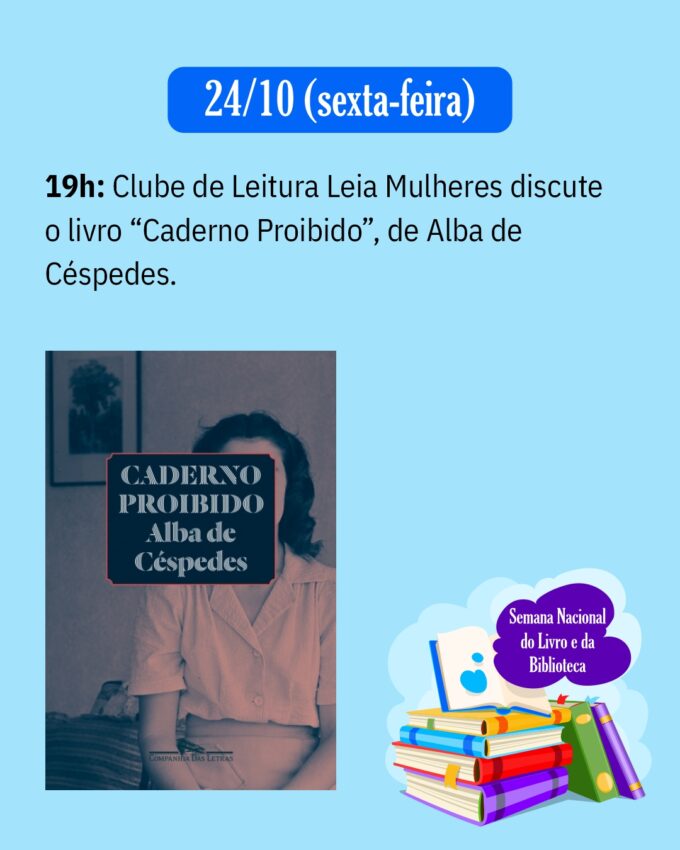 Na sexta-feira, 24 de outubro, às 19h, o Clube de Leitura Leia Mulheres encerra o dia com a discussão do clássico “Caderno Proibido”, de Alba de Céspedes, obra que aborda temas como liberdade feminina e o papel da mulher na sociedade.