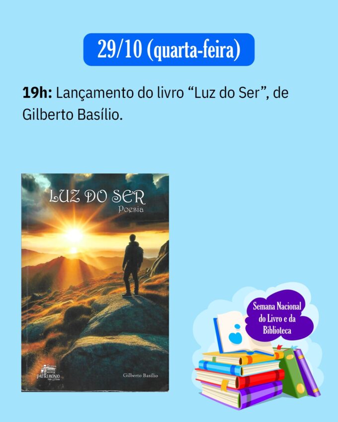 Encerrando a programação, no dia 29 de outubro (quarta-feira), às 19h, acontece o lançamento do livro “Luz do Ser”, de Gilberto Basílio, coletânea com 178 poesias, selecionadas ao longo da trajetória do autor.