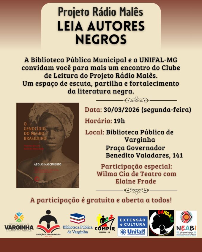 Já no dia 30, será realizado o encontro do Projeto Rádio Malês, com a discussão do livro O genocídio do negro brasileiro. A iniciativa integra um Acordo de Cooperação, Coparticipação e Apoio entre a Universidade Federal de Alfenas (UNIFAL-MG) e a Fundação Cultural de Varginha, por meio da Biblioteca Pública.