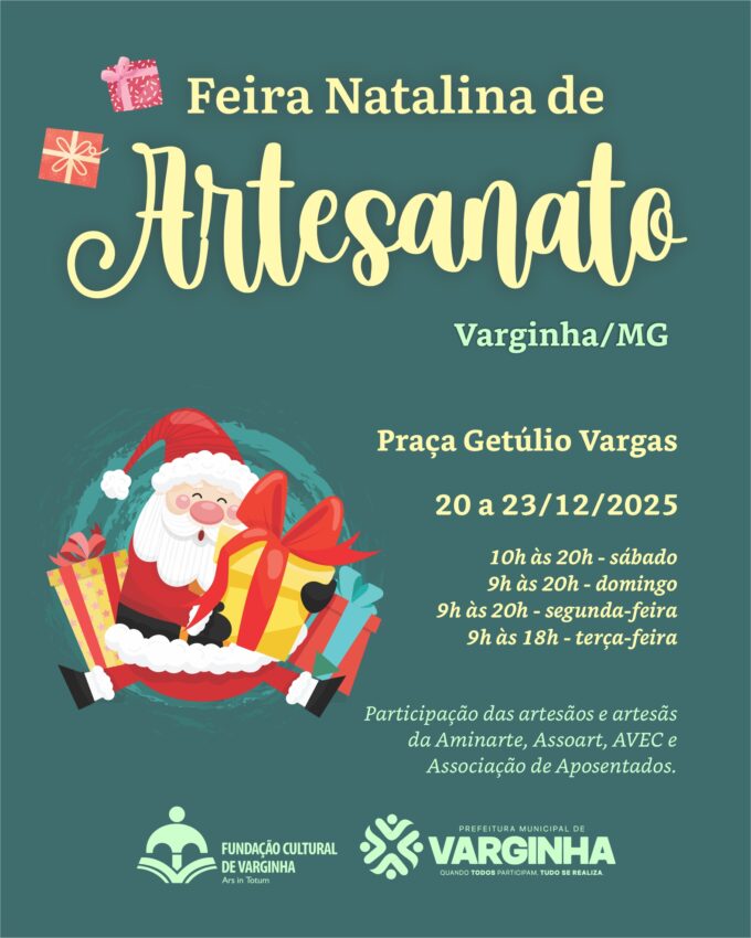 A cidade de Varginha recebe, entre os dias 20 e 23 de dezembro de 2025 (sábado a terça-feira), a Feira Natalina de Artesanato, que será realizada na Praça Getúlio Vargas. O evento reúne o melhor da produção artesanal local, oferecendo ao público uma opção diferenciada para as compras de fim de ano.