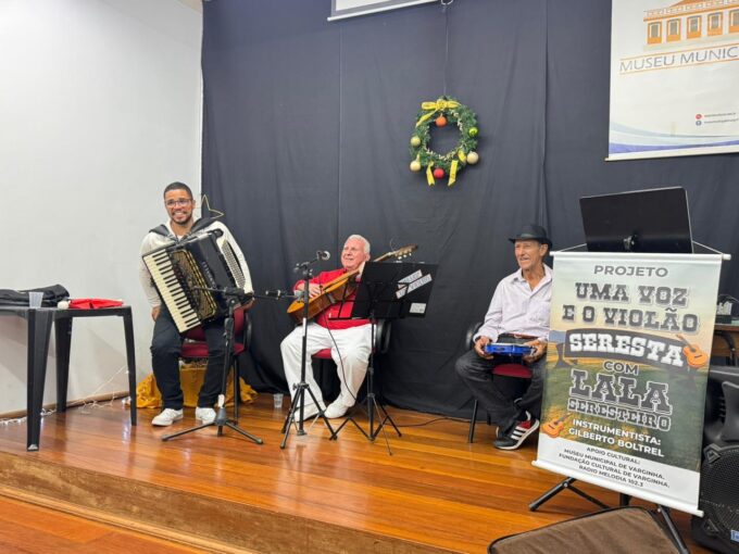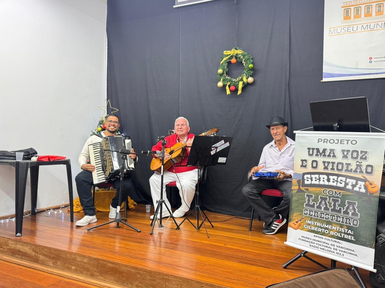 O Museu Municipal de Varginha recebeu, na noite desta quinta-feira (18/12), a edição especial de Natal do projeto “Uma Voz e o Violão”. O evento contou com a presença do prefeito Leonardo Ciacci, do diretor-superintendente da Fundação Cultural de Varginha, Marquinho Benfica, e do diretor do Museu Municipal, Henrique Lemes, além de um público que prestigiou a programação cultural.