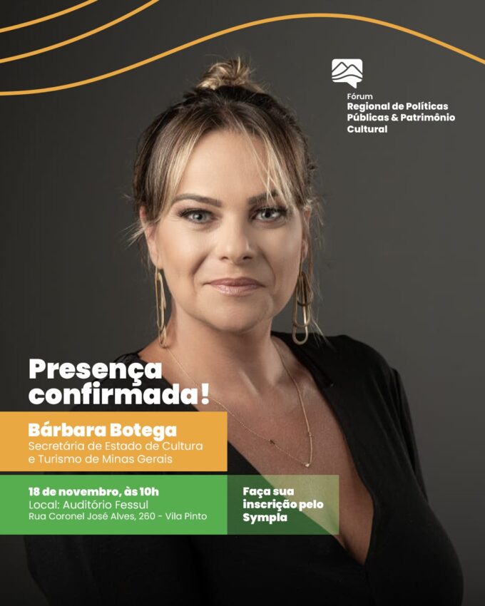 Entre os personagens confirmados para o Fórum Regional de Políticas Públicas e Patrimônio Cultural, destaque para a participação de Bárbara Botega, Secretária Estadual de Cultura e Turismo de Minas Gerais, e logo após a Palestra com o João Miguel Coordenador do TCE Cultural do Tribunal de Contas de Minas Gerais que fará a abertura do primeiro painel, com o tema Cultura, Patrimônio e Identidade Local.