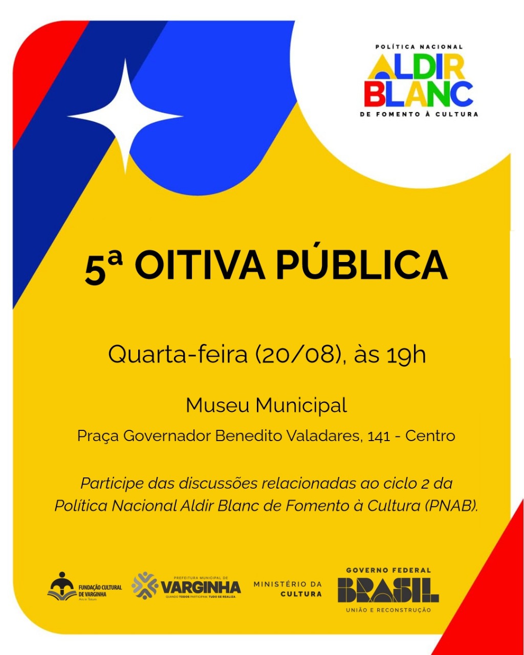 A Prefeitura de Varginha, por meio da Fundação Cultural e Conselho Municipal de Política Cultural, convida artistas, produtores e representantes da sociedade civil para participarem da 5ª Oitiva Pública da Política Nacional Aldir Blanc de Fomento à Cultura (PNAB).