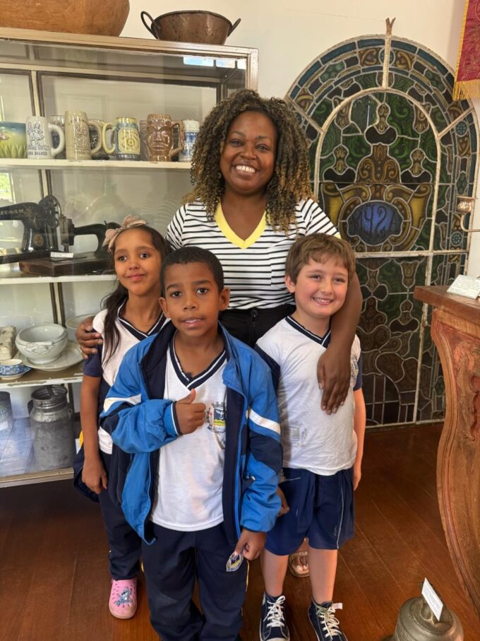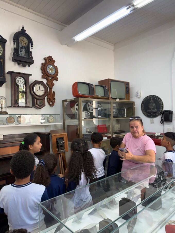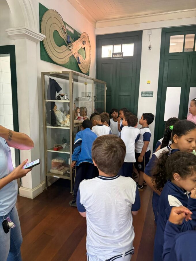 A visita foi conduzida pela produtora de eventos Érika Tobias, que apresentou os diferentes espaços expositivos e contextualizou as peças para o grupo. A atividade integra o projeto “Objetos que fazem história”, desenvolvido com os alunos, com o objetivo de estimular o resgate de memórias familiares, especialmente a partir das histórias de seus avós e avós.